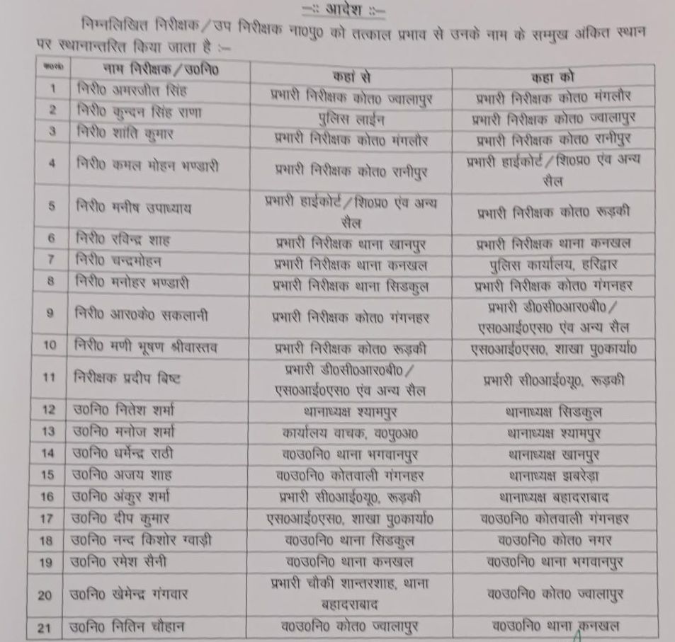 हरिद्वार:- पुलिस विभाग में बड़ा फेरबदल, अमरजीत सिंह होगे मंगलौर कोतवाली प्रभारी निरीक्षक, कुन्दन सिंह राणा को मिली ज्वालापुर कोतवाली की कमान,देखे लिस्ट–