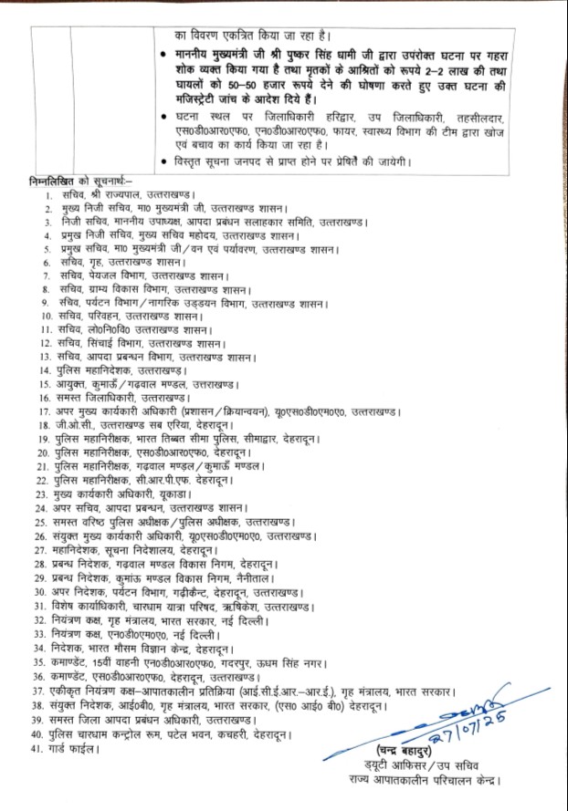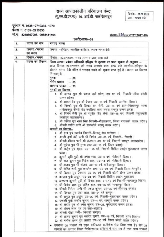 हरिद्वार:- मुख्यमंत्री धामी ने मनसा देवी मंदिर भगदड़ में मृतको के परिवारो को दो- दो लाख व घायलों को ₹50–50 हजार सहायता राशि देने की घोषणा